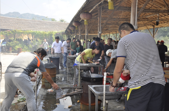 第一天拓展,第二天让我们来个野炊,一起配合烹饪一桌美食大餐吧。男抓鸡来女捉鱼,他煮蟹来她灼虾,大家分工合作,一起动手,一顿香喷喷的饭菜就在轻松惬意的氛围里上桌了。重庆的辣子鸡、广东的啤酒鸡、河南的土豆焖鸡,还有东北的炖鸡等等各地的美味汇聚一堂。马上开动,一起畅享小伙伴们合力创造的美味大餐吧!