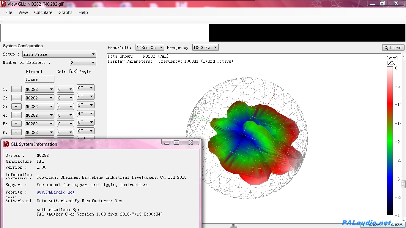 下图为EASE数据库中的PAL 线形阵列音箱的3维声压指向图: