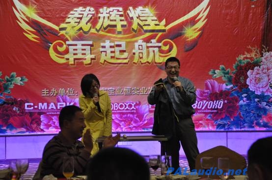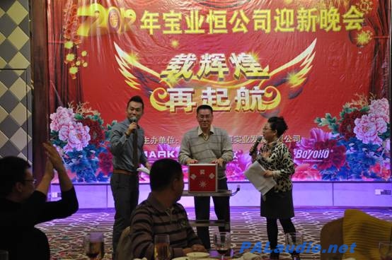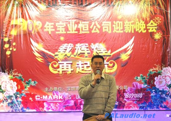 公司董事长兼总经理周宝宁先生首先发表新年祝词。祝词中,周总表示:尽管2011年国际政经形势严峻,但在全体员工的共同努力下和国内外经销商的鼎力支持下,宝业恒仍然实现了20%的既定增长目标,取得了骄人的成绩,创下了公司年度销售额、部门业务成长性、单月销售额等多项历史新高。在对成绩欢欣鼓舞的同时,周总不忘勉励大家同舟共济,共同面对即将到来的2012年。致辞结束时,周总展示了神秘的新年礼物------全球音响人翘首以待的----宝业恒自主研发的全球首款数字调音台,并宣布重大利好消息---从2012年1月1日起,宝业恒数字调音台正式面向国内外市场发售。在场的全体员工及嘉宾客户顿时掌声雷动、群情激昂。